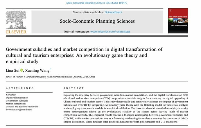 近日,我院隋丽娜教授团队在《Socio-Economic Planning Sciences》上发表论文Government subsidies and market competition in digital transformation of cultural and tourism enterprises: An evolutionary game theory and empirical study(2026年03月)。该期刊是在公共政策与量化分析交叉领域享有盛誉的国际性跨学科期刊,是中科院经济学一区TOP期刊,SSCI、SCI检索期刊,JCR Q1经济学领域排名前7%,最新影响因子5.4。论文由隋丽娜教授担任第一作者,我院研究生王雪宁为第二作者兼通讯作者。